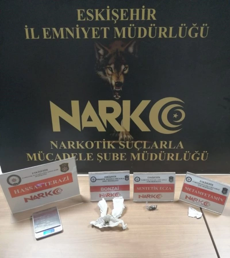 Eskişehir Emniyet Müdürlüğü Narkotik Suçlarla Mücadele Şubesi ekiplerince sokak satıcılarının yakalanmasına yönelik olarak yapılan çalışmalarda, Hoşnudiye Mahallesi Barlar Sokağı civarında 3 şahıs yakaladı. Yapılan aramalarda; 1,11 gram bonzai, 0,16 gram metamfetamin, 3 adet sentetik ecza, 1 adet hassas terazi ele geçirildi.