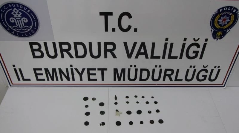 Burdur’da uyuşturucu madde operasyonunda yapılan aramada uyuşturucu enjekte edilmiş bir bez parçası ve tarihi eser olduğu değerlendirilen 25 adet sikke ile 3 adet metal obje ele geçirildi.
