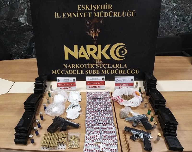 Eskişehir’de yapılan uyuşturucu operasyonunda 2 kişi tutuklanırken, şahısların evinde yapılan aramada değişik tür ve miktarlarda uyuşturucu maddeler, silah ve mermi ele geçirildi.