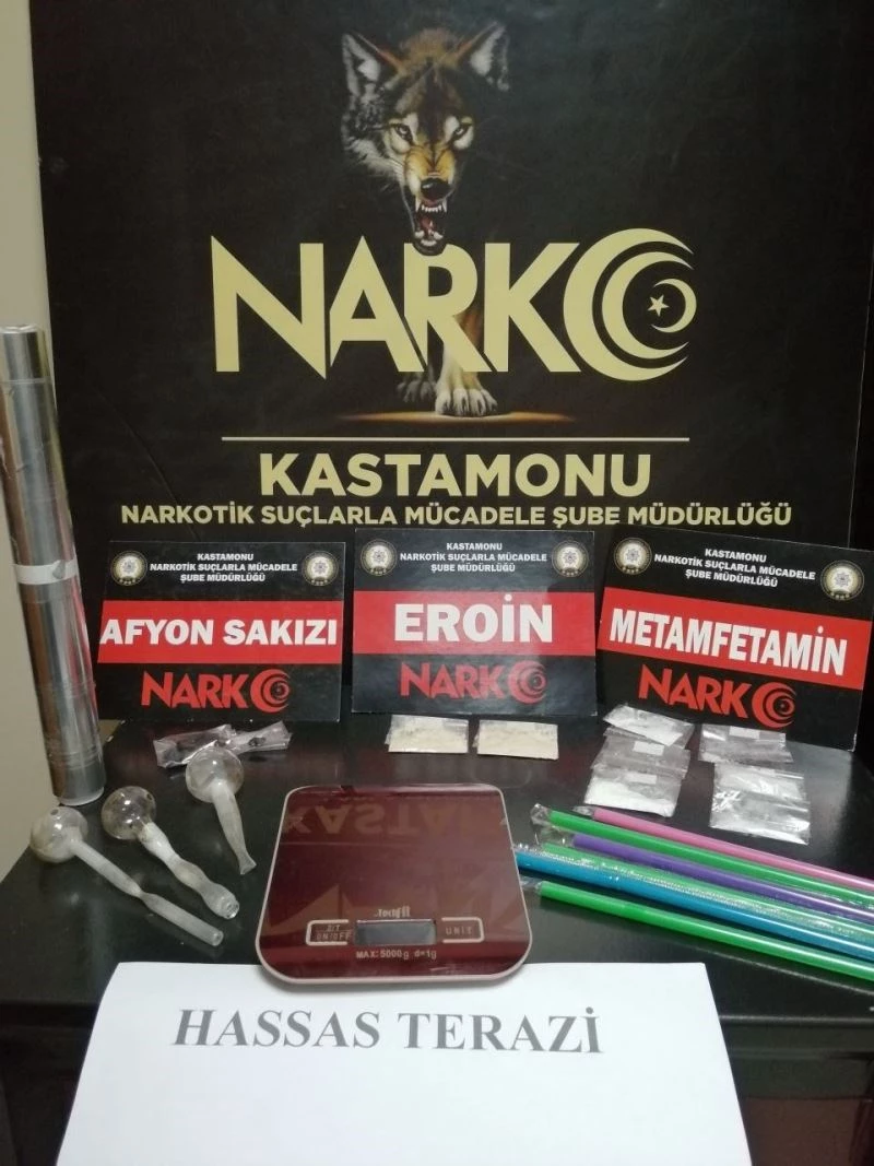 Edinilen bilgiye göre, Kastamonu İl Emniyet Müdürlüğü Narkotik Suçlarla Mücadele Şube Müdürlüğü görevlilerince uyuşturucu madde kullanan ve satan şahıslara yönelik çalışmalar çerçevesinde operasyon gerçekleştirildi. Operasyonda muhtelif miktarlarda eroin, afyon sakızı ve metamfetamin maddesi, 3 adet uyuşturucu içiminde kullanılan cam düzenek, 1 adet hassas terazi ve 31 adet uyuşturucu satışında kullanılan pipet ele geçirildi.