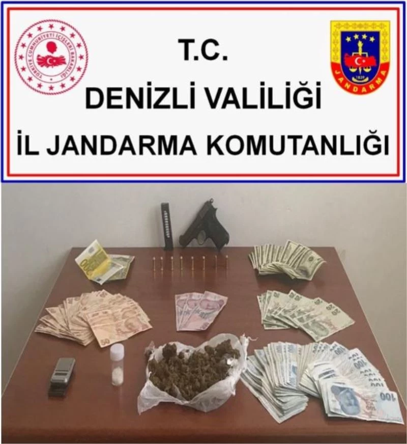 Edinilen bilgiye göre; Denizli İl Jandarma Komutanlığı Kaçakçılık ve Organize Suçlarla Mücadele Şube Müdürlüğü ekipleri, uyuşturucu ticaretiyle mücadele çalışmaları kapsamında Pamukkale ilçesi Kınıklı Mahallesinde tespit edilen adrese operasyon düzenledi. Uyuşturucu madde satışı yapan şahıslara yönelik yapılan operasyonda, 300 gram skunk madde, 20 gram metamfetamin ve uyuşturucu madde satışında elde edilen 10 bin 320 TL ile 1 adet 7,65 mm çapında tabanca, 1 adet tabancaya ait şarjör, 8 adet 7,65 mm çapında fişek, 21 adet sahte 100 dolar, 2 adet sahte 200 euro ve uyuşturucu madde tartımında kullanılan 1 adet hassas terazi ele geçirildi.