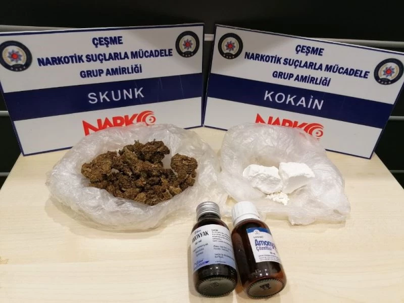 Çeşme İlçe Emniyet Müdürlüğü Narkotik Suçlarla Mücadele Grup Amirliği ekipleri, H.G. isimli bir şahsın, uyuşturucu ticareti yapmak için ilçeye geldiği bilgisi üzerine çalışma başlattı. Harekete geçen ekipler, şahsın kaldığı otel odasına operasyon düzenledi. Ekipler, H.G.’nin odasında 60 bin TL değerinde 55 gram kokain, 25 gram esrar maddesi ve uyuşturucu madde çoğaltmak amacıyla kullanılan 2 şişe amonyak ele geçirdi.