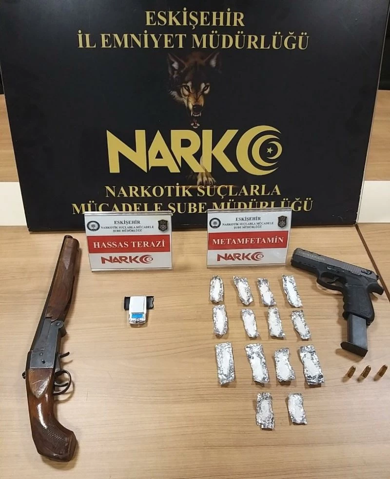 Eskişehir İl Emniyet Müdürlüğü ekipleri, uyuşturucu madde sattığı tespit edilen şüpheliyi düzenlenen operasyonda bir evde yakalarken, çok miktarda uyuşturucu maddenin yanı sıra tabanca ve tüfek de ele geçirdi.