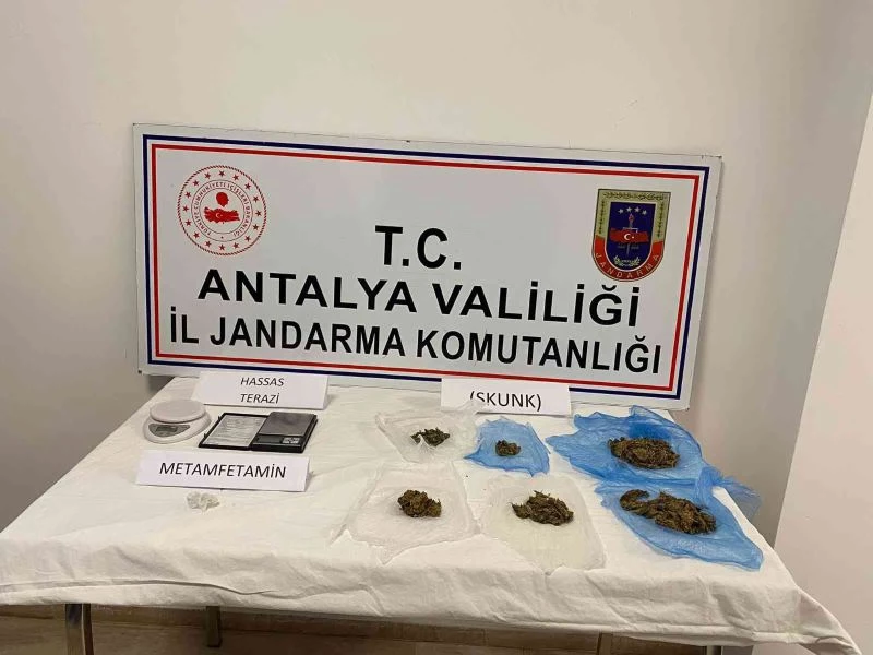 Manavgat ilçesinde uyuşturucu madde ile mücadele kapsamında yapılan çalışmalarda Z.G. isimli şahısın uyuşturucu madde satışı yaptığı bilgisi alınması üzerine Manavgat İlçe Jandarma Komutanlığı İstihbarat, KOM Timi ve Side Jandarma Karakol Komutanlığı ekipleri tarafından operasyon yapıldı. Şüphelinin adresinde yapılan aramada, 140 gram skunk, 2 adet hassas terazi ve 1 gram metafamtamin uyuşturucu madde ele geçirildi.