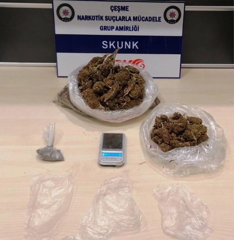 Çeşme İlçe Emniyet Müdürlüğü Narkotik Suçlarla Mücadele Grup Amirliği ekipleri, F.V., K.D. ve B.Ş. isimli şahısların uyuşturucu ticareti yapmak için ilçeye geldiği bilgisi üzerine çalışma başlattı. Harekete geçen ekipler, yeri tespit edilen şahıslara yönelik operasyon düzenledi. Yapılan operasyonda şahısların kullandığı araç içerisinden 135 gram esrar ve konakladıkları otel odasından uyuşturucu madde ticaretinde kullanıldığı değerlendirilen 1 adet hassas terazi, parçalanmış halde şeffaf poşetler ve bir miktar esrar maddesi ele geçirildi.