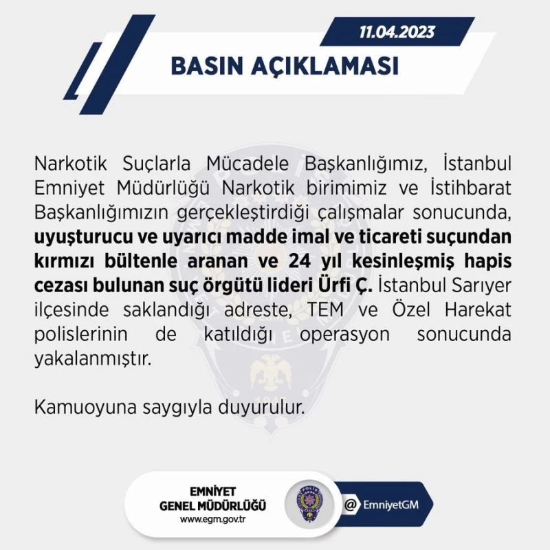 Emniyet Genel Müdürlüğünden yapılan açıklamaya göre, Narkotik Suçlarla Mücadele Başkanlığı, İstanbul Emniyet Müdürlüğü Narkotik birimi ve İstihbarat Başkanlığının gerçekleştirdiği çalışmalar sonucunda Uyuşturucu ve uyarıcı madde imal ve ticareti suçundan kırmızı bültenle aranan ve hakkında 24 yıl kesinleşmiş hapis cezası bulunan suç örgütü lideri Ürfi Ç. İstanbul’un Sarıyer ilçesinde saklandığı adreste TEM ve Özel Harekat polislerinin de katıldığı operasyon sonucunda yakalandı.