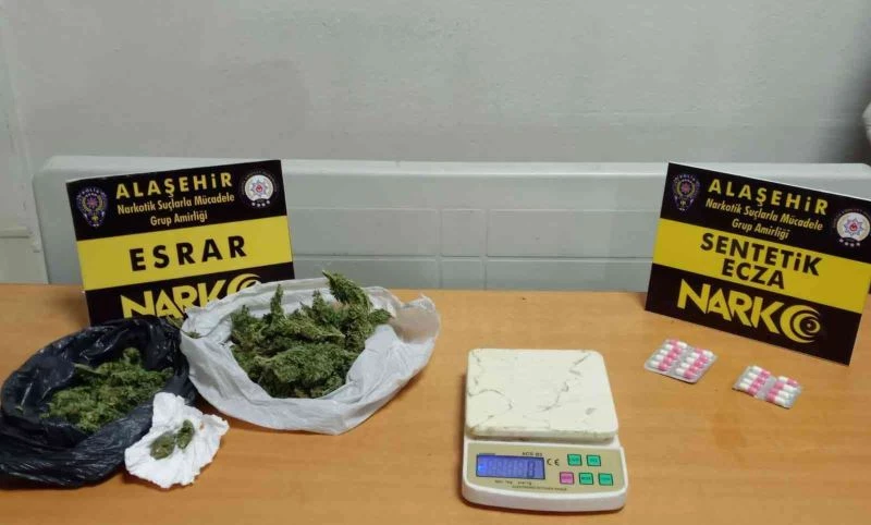 Alaşehir İlçe Emniyet Müdürlüğü Narkotik Suçlarla Mücadele Grup Amirliği ve İlçe Emniyet Müdürlüğü görevlilerince ’Uyuşturucu madde satan, kullanan ve nakleden’ şahıslara yönelik dün yapılan çalışmalar çerçevesinde İ.K. (29), M.G. (29) ve İ.Ö. (31) isimli şahıslarla birlikte 18 adet 300 mg sentetik ecza hapı, peçeteye sarılı halde daralı 3.03 gram esrar, beyaz poşet içerisinde daralı 55.81 gram esrar, siyah poşet içerisinde daralı 20.75 gram esrar, 1 adet hassas terazi olmak üzere toplamda 79.59 gram esrar ele geçirildi. Zanlılardan İ.K. çıkarıldığı mahkeme tarafından tutuklanırken, diğer şahısların savcılık tarafından serbest bırakıldığı açıklandı.
