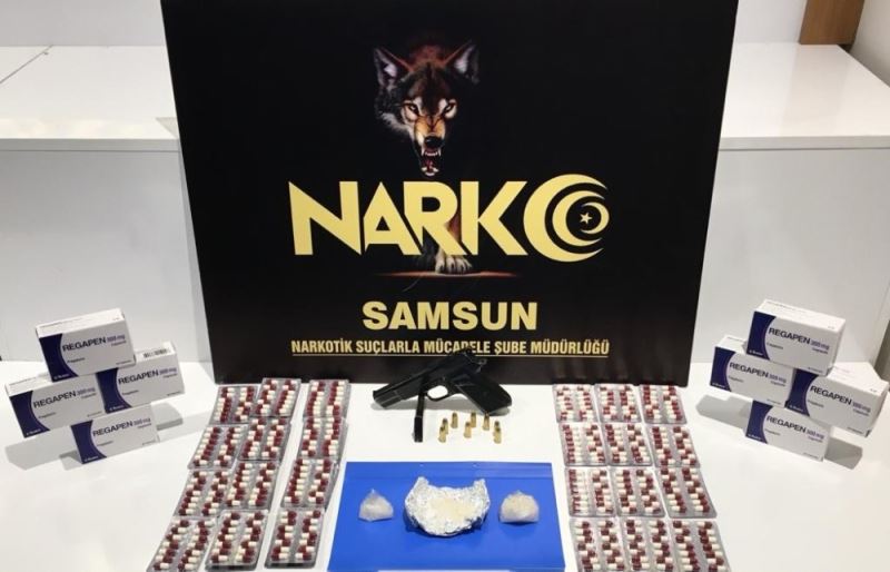 Edinilen bilgiye göre, Samsun Emniyet Müdürlüğü Narkotik Suçlarla Mücadele Şube Müdürlüğü ekipleri, Atakum ilçesi Cımhuriyet Mahallesi’nde uyuşturucu madde satışı yaptıkları bilgisi edinilen S.Ö.’yü takibe aldı. Gözaltına alınan S.Ö.’nün üzerinde iki paket halinde 34,74 gram metamfetamin maddesi ele geçirildi. Olayın devamında S.Ö.’nün ikametinde yapılan aramada, 9,32 gram metamfetamin maddesi, 448 adet sentetik ecza hap, 1 adet 9 mm çapında tabanca ve 8 adet 9 mm çapında tabanca mermisi elde edildi. Olayla ilgili soruşturma başlatıldı.