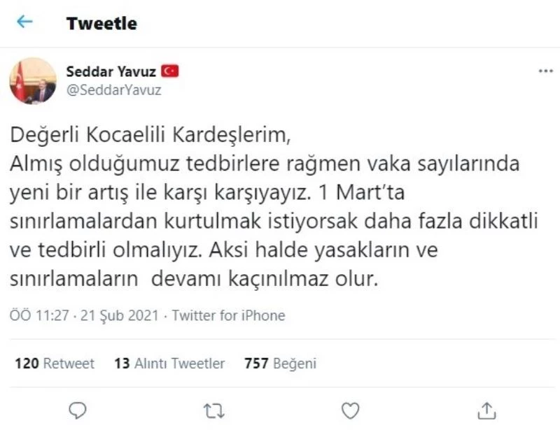 Kocaeli’de artan vaka sayıları sonrasında sosyal medya üzerinden vatandaşları uyaran Vali Seddar Yavuz, alınan tedbirlere rağmen vaka sayılarında yeni bir artış yaşandığını söyledi. Daha sonra açıklama yapan İl Sağlık Müdürü Yüksel Pehlevan ise, "En son hasta taburcu olup, testi negatif çıkana kadar önlemlere aksatmadan devam etmemiz lazım" dedi.