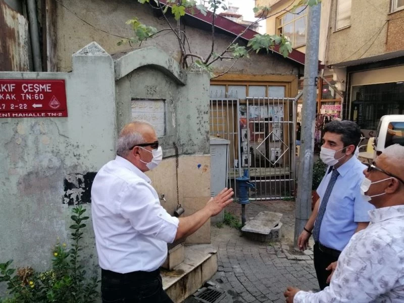 Bölge Müdürü Erdal Pınar ile Başkan Çetin Bozkurt daha sonra bakım onarımına devam edilen Merkez Yeni Cami inşaatı ile Vakıfçeşme Sokak’ta bulunan Vakıflar Bölge Müdürlüğü’ne ait çeşmede incelemelerde bulundu.