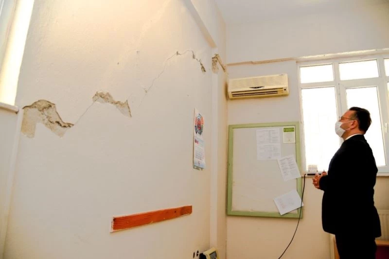 Vali Aksoy, depremde hasar gören okul binasında incelemede bulundu