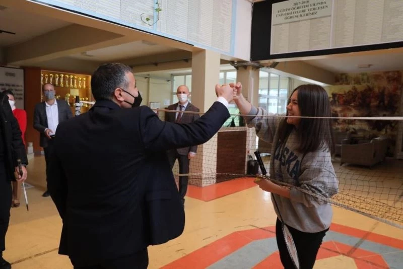 DÜZCE – Düzce Valisi Cevdet Atay, Cumhuriyet Anadolu Lisesi’ni ziyareti esnasında okul içerisinde oluşturulan alanda Badminton oynayan öğrencileri bir süre izlemesinin ardından kendisi ile birlikte maç teklifi yapan öğrenciyi kırmayarak Badminton oynadı.