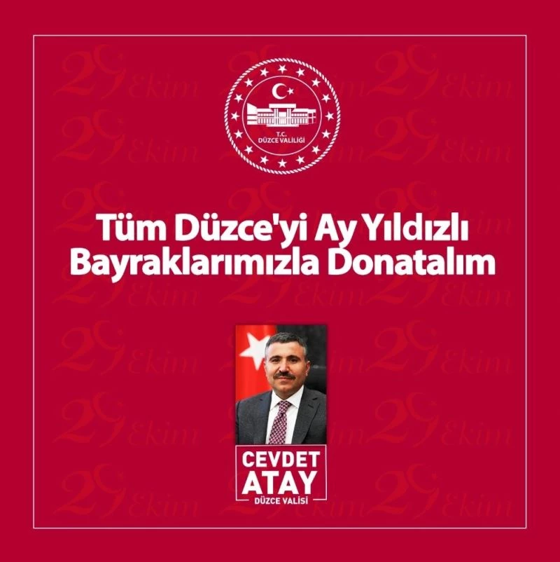 29 Ekim Cumhuriyet Bayramı’nın 97. yılı münasebeti ile Düzce’de bir dizi etkinlikler düzenlenecek. Korona virüs gölgesinde sade bir tören ile gerçekleştirilecek programların dışında Düzce Valisi Cevdet Atay, Düzcelilere çağrıda bulundu. 29 Ekim Cumhuriyet Bayramı dolayısı ile sosyal medya hesaplarından yapılan çağrıda, “ Tüm Düzce’yi Ay-Yıldızlı Bayraklarla Donatalım’ denildi. Vali Atay’ın bu mesajına karşılık olarak tüm resmi kurum ve kuruluşlarda bayrak asılmaya başlandı. Vatandaşlarında çağrıya cevap vermesi bekleniyor.