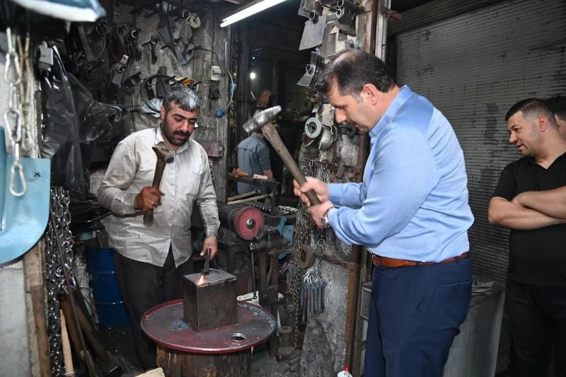 Şanlıurfa Valisi Salih Ayhan, hafta sonu tarihi çarşılar bölgesindeki esnafı ziyaret ederek çay ikramlarına eşlik edip demircide demir dövdü.