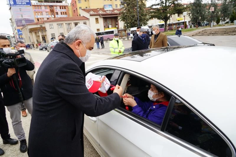 Vali Çakır, etkinlikte araçları durdurarak sürücülere ve çocuklara şapka ile düdük hediye etti.