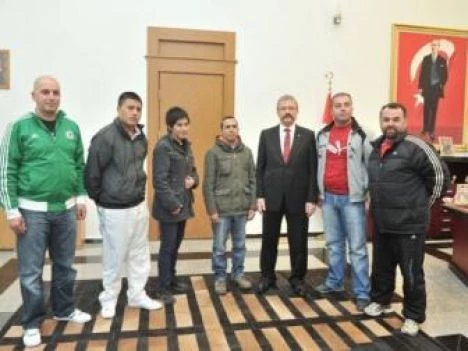 OSMANİYE - Vali Celalettin Cerrah, Isparta Erbil Spor Kulübü Tayland Boksu sporcuları, antrenör ve hakemlerini makamında kabul etti. Muay Thai (Tayland Boksu) sporcuları Ali Erdoğan Yılmaz ve Raziye Nur Mert?e İl Temsilcisi Murat İşler, Milli Takım Antrenörü Yaşar Erbil, Antrenör ve Hakem Bekir Maral, Antrenör ve Hakem Bülent Çetin eşlik etti. Vali Cerrah?a çeşitli hediyeler sunan İl Temsilcisi Murat İşler tüm Isparta halkından sevgi ve saygı getirdiklerini söyleyerek; ?Kadirli?de 10?11 Mart tarihleri arasında düzenlenecek olan Muay Thai Akdeniz Bölge Şampiyonası için Osmaniye?de bulunuyoruz. Bu vesile ile de Sayın Valimizi ziyaret etmek istedik. Bizleri kabul ettiği için teşekkür ediyoruz.?diye konuştu. Vali Cerrah ise sporcuları ve antrenörlerini Osmaniye?de ağırlamaktan memnuniyet duyduğunu ifade ederek; ?Tüm gençlerimizin sporla uğraşmalarını arzu ediyorum. Çünkü spor hem onları zinde tutuyor ve sağlıklı olmalarını sağlıyor hem de kötü alışkanlıklardan uzak tutuyor. Bu nedenle ilimizde çocuklarımız ve gençlerimiz için spor alanlarını artırmaya çalışıyoruz.?diye konuştu. Vali Cerrah, Kadirli?de yapılacak olan Muay Thai Akdeniz Bölge Şampiyonasına Osmaniye, Adana, Mersin, Antalya, Isparta, Hatay, Burdur illerinden katılacak olan tüm sporculara başarılar dileyerek sözlerine son verdi.