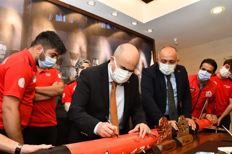 Dünyanın en büyük Havacılık, Uzay ve Teknoloji Festivali (TEKNOFEST) 2021’de düzenlenen roket yarışmasında orta irtifa kategorisinde Türkiye 1’incisi olan Atakum Gençlik Merkezi Tanyeli Roket Takımı, Vali Doç. Dr. Zülkif Dağlı’yı makamında ziyaret etti.