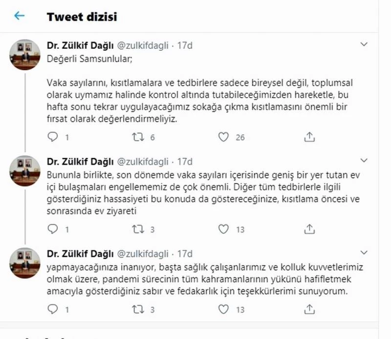 “Değerli Samsunlular; vaka sayılarını, kısıtlamalara ve tedbirlere sadece bireysel değil, toplumsal olarak uymamız halinde kontrol altında tutabileceğimizden hareketle, bu hafta sonu tekrar uygulayacağımız sokağa çıkma kısıtlamasını önemli bir fırsat olarak değerlendirmeliyiz. Bununla birlikte, son dönemde vaka sayıları içerisinde geniş bir yer tutan ev içi bulaşmaları engellememiz de çok önemli. Diğer tüm tedbirlerle ilgili gösterdiğiniz hassasiyeti bu konuda da göstereceğinize, kısıtlama öncesi ve sonrasında ev ziyareti yapmayacağınıza inanıyor, başta sağlık çalışanlarımız ve kolluk kuvvetlerimiz olmak üzere, pandemi sürecinin tüm kahramanlarının yükünü hafifletmek amacıyla gösterdiğiniz sabır ve fedakarlık için teşekkürlerimi sunuyorum.”
