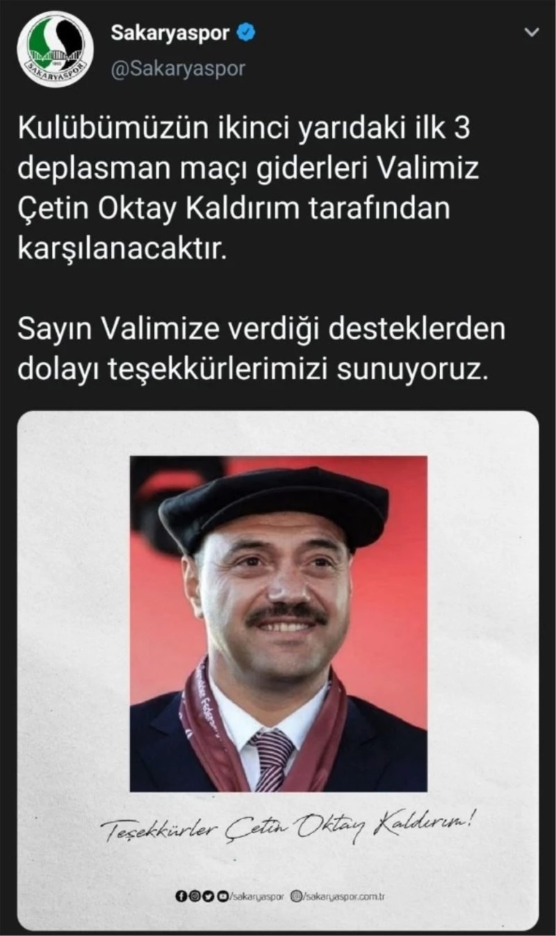 Sakaryaspor sosyal medya hesabından, Sakarya Valisi Çetin Oktay Kaldırım’ın ligin ikinci yarısında yeşil siyahlı takımın oynayacağı ilk üç deplasmanın masraflarını karşılayacağını açıkladı.