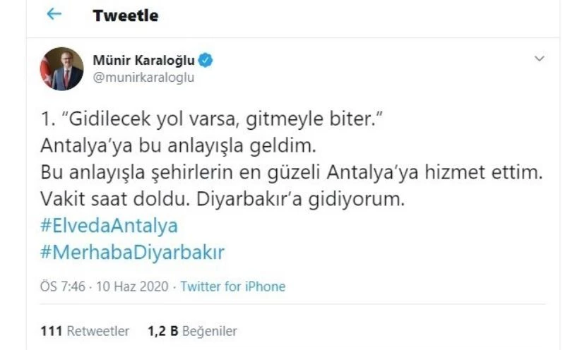 Valiler Kararnamesine göre Diyarbakır Valiliği’ne atanan Antalya Valisi Münir Karaloğlu, Antalyalılara sosyal medya hesabından veda etti. Karaloğlu, “Gidilecek yol varsa, gitmeyle biter. Antalya’ya bu anlayışla geldim. Bu anlayışla şehirlerin en güzeli Antalya’ya hizmet ettim. Vakit saat doldu. Diyarbakır’a gidiyorum” dedi.