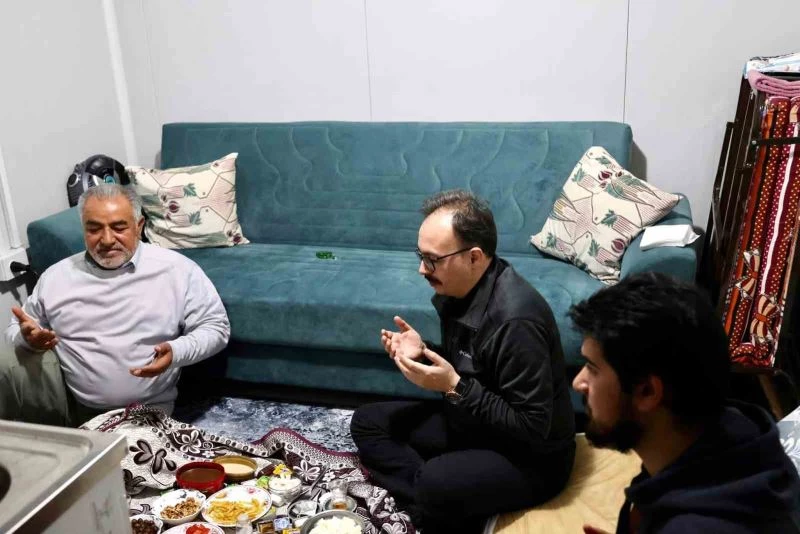 Vali Kızılkaya Ramazanın ilk gününde görevinin başında olmaktan duyduğu memnuniyeti ifade ederek, “Teravih Namazında Elbistanlı hemşerilerimizle birlikte ellerimizi semaya açtık, alnımızı secdeye koyduk. Sahurda da Celal amcamızın ve ailesinin konteynır kentteki sofrasına konuk olduk. Dua ve kabul ayı mübarek Ramazan ayında gönüllülerimiz de bir dualarımız da bir. Allah, ülkemizi her türlü afetten ve beladan korusun. Ramazan’ın manevi kudretini Elbistan’da birlikte hissettik” dedi.
