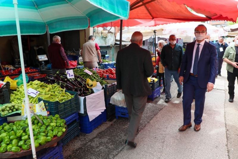 Vali Seddar Yavuz, tüm dünyayı ve Türkiye’yi etkisi altına alan korona virüs (Kovid-19) ile mücadele kapsamında, azar alanlarında da uygulanan tedbirleri yerinde denetledi. Vatandaşların en çok kalabalık oluşturduğu yerler arasında olan pazar alanlarında maske ve eldiven kullanımı, sosyal mesafe gibi başlıca kuralları yerinde inceleyen Vali Seddar Yavuz, satıcı, vatandaş ve görevlilere uyarılarda da bulundu.