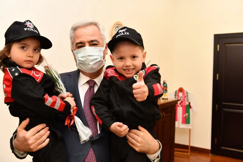 Ziyarete emniyet mensuplarıyla birlikte gelen polis üniformalı miniklerle de yakından ilgilenen Vali Seymenoğlu, Eflin ve Mehmet Efe kardeşlerle hatıra fotoğrafı çektirdi.