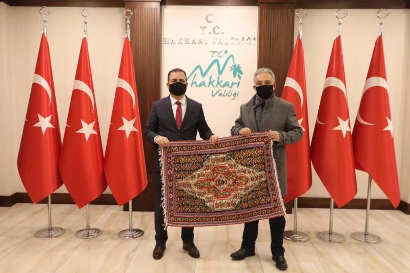 Hakkari’de daha önce vali olarak görev yapan Merkez Valisi Cüneyt Orhan Toprak, Hakkari Valisi İdris Akbıyık’ı da makamında ziyaret ederek bir süre sohbet etti. Vali Akbıyık, Vali Toprak’a Hakkari hatırası olarak genç kızların dokuduğu el emeği göz nuru kilim hediye etti.