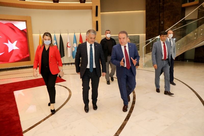 Antalya Valisi Ersin Yazıcı, Büyükşehir Belediye Başkanı Muhittin Böcek’i ziyaret ederek, belediyenin çalışmaları hakkında bilgi aldı. Belediyeciliğin heyecanlı ama bir o kadar da meşakkatli bir iş olduğunu söyleyen Vali Yazıcı, “Hepimiz bu ülkenin, bu şehrin güzel insanlarına hizmet etmek için varız” dedi. Antalyalılara hizmet etmekten onur duyduğunu ifade eden Başkan Böcek de Vali Yazıcı’ya bir kez daha görevinde başarılar diledi.