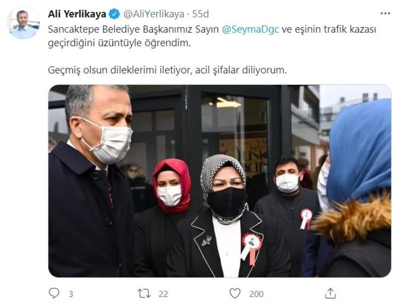 İstanbul Valisi Ali Yerlikaya, AK Parti 7. Olağan Kongresinden dönüşü sırasında Kuzey Marmara Otoyolunda kaza yapan Sancaktepe Belediye Başkanı Şeyma Döğücü’yle ilgili paylaşımda bulunarak geçmiş olsun dileklerini iletti. Vali Yerlikaya, “Sancaktepe Belediye Başkanımız Sayın Şeyma Döğücü ve eşinin trafik kazası geçirdiğini üzüntüyle öğrendim. Geçmiş olsun dileklerimi iletiyor, acil şifalar diliyorum” dedi.