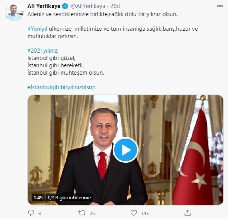 Vali Yerlikaya resmi twitter adresi üzerinden yaptığı açıklamada, “Yeni yıl ülkemize, milletimize ve tüm insanlığa sağlık, barış, huzur ve mutluluklar getirsin. 2021yılınız, İstanbul gibi güzel, İstanbul gibi bereketli, İstanbul gibi muhteşem olsun” sözlerine yer verdi.