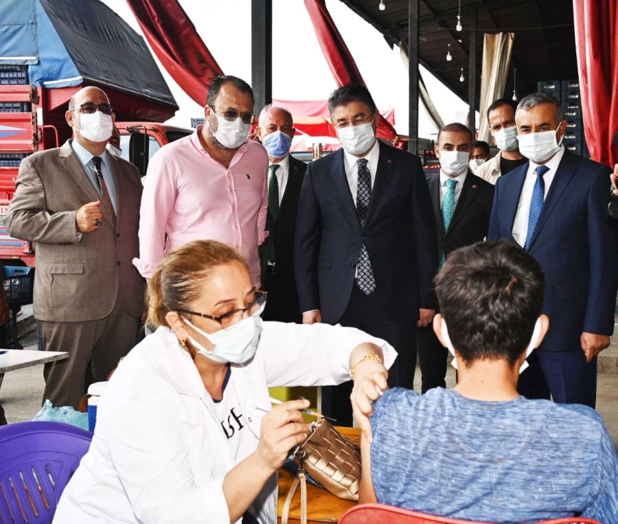 Vali Dr. Erdinç Yılmaz’ın denetimleri sırasında, aşı olmak isteyen vatandaşlarımız Sebze ve Meyve Halinde kurulan aşı standında, aşılarını yaptırdılar. Denetimleri öncesinde aşı standını ziyaret eden Vali Dr. Erdinç Yılmaz, aşı ekiplerine çalışmalarından dolayı teşekkür etti. Vali Yılmaz, Sebze ve Meyve Halinde gerçekleştirdiği denetimlerinde, hal esnafı ve vatandaşlarımızla bir süre sohbet ederek, korona virüsle mücadelede tedbirlere hassasiyetle uyulmasının ve aşı yaptırmanın çok önemli olduğunu söyledi.