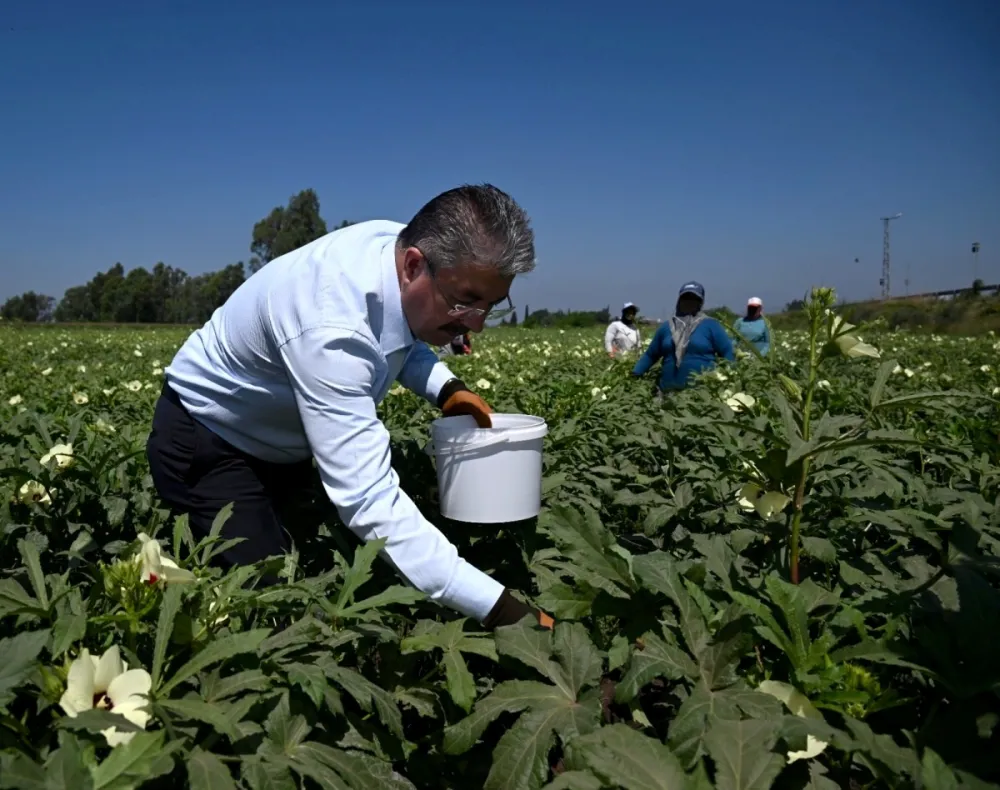 Hasat öncesi Tarım ve Orman İl Müdürü Erdem Kolabaş'tan rekolte beklentisi ve hasat hakkında bilgi alan Vali Yılmaz, daha sonra tarlaya girerek bamya topladı.