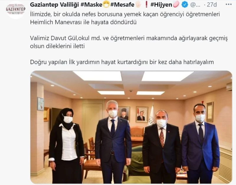 Olayın kahramanı olan öğretmenler Sabure Özdemir ve Aydın Kaya ile okul müdürü Süleyman Çevik’i makamında misafir eden Gaziantep Valisi Davut Gül, bizzat teşekkürlerini iletti. Konu ile ilgili valiliğin resmi sosyal medya hesabından yapılan paylaşımda, "İlimizde bir okulda nefes borusuna yemek kaçan öğrenciyi öğretmenleri Heimlich Manevrası ile hayata döndürdü. Valimiz Davut Gül, okul müdürü ve öğretmenleri makamında ağırlayarak geçmiş olsun dileklerini iletti. Doğru yapılan ilk yardımın hayat kurtardığını bir kez daha hatırlayalım" ifadelerine yer verildi.