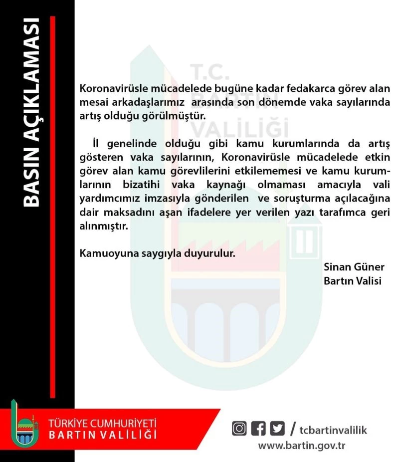 İl Salgın Denetim Merkezi Başkanı olan Vali Yardımcısı Abdullah Akdaş imzasıyla kamu kurum ve kuruluşlarına gönderilen resmi yazı tepkilere neden olurken Bartın Valisi Sinan Güner tarafından kararın geri çekildiği duyuruldu.