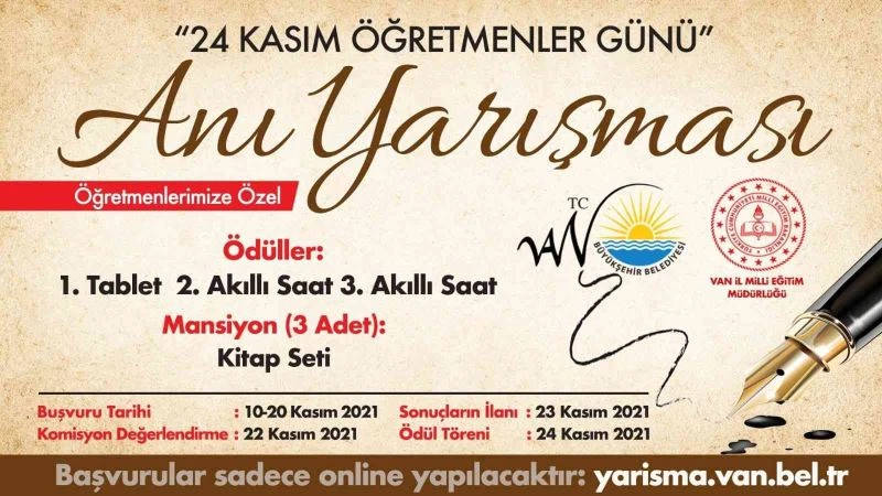 Yaptığı kültürel etkinliklerle her kesime hitap eden Van Büyükşehir Belediyesi, ‘24 Kasım Öğretmenler Günü’ne özel anı yarışması düzenledi. Kültür ve Sosyal İşler Dairesi Başkanlığı organizesinde yapılan yarışmaya başvurular 10-20 Kasım 2021 tarihleri arasında online olarak yarisma.van.bel.tr adresi üzerinden yapıldı.