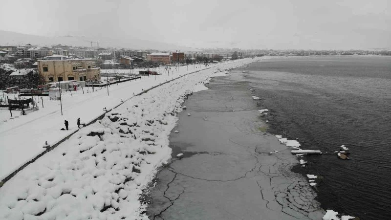 Bitlis’te kar yağışının durmasının ardından başlayan şiddetli soğuklar, Türkiye’nin en büyük sodalı gölü olan Van Gölü kıyılarının buz tutmasına yol açtı. Van-Tatvan arasında 3 bin 755 kilometrekare alana sahip gölün kıyıları, hava sıcaklığının gece sıfırın altında 15 dereceye kadar düşmesiyle buzla kaplandı. Göl kıyısındaki buz tabakasının üzerine yağan ince kar da bembeyaz görüntüsüyle seyrine doyumsuz görüntüler oluşturdu. Göl kıyılarında görenleri hayran bırakan manzara, havadan drone ile görüntülendi.