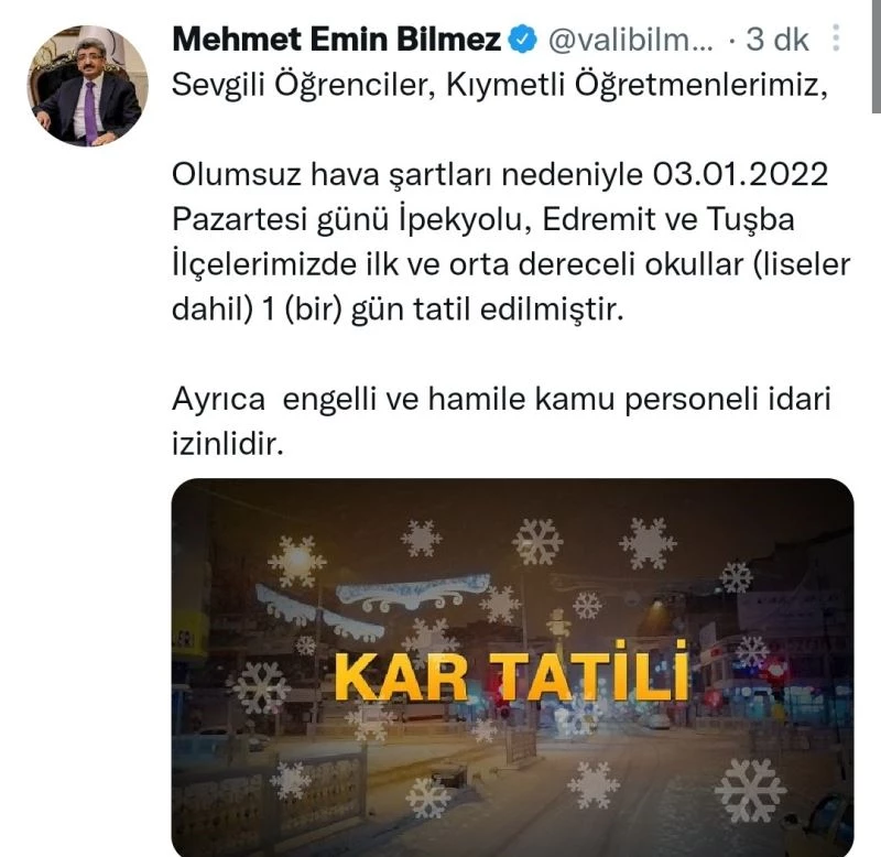 Van Valiliğinden yapılan açıklamada, “Olumsuz hava şartları nedeniyle 3 Ocak 2022 Pazartesi günü İpekyolu, Edremit ve Tuşba ilçelerimizde ilk ve orta dereceli okullar (liseler dahil) 1 (bir) gün süreyle tatil edilmişti” denildi.
