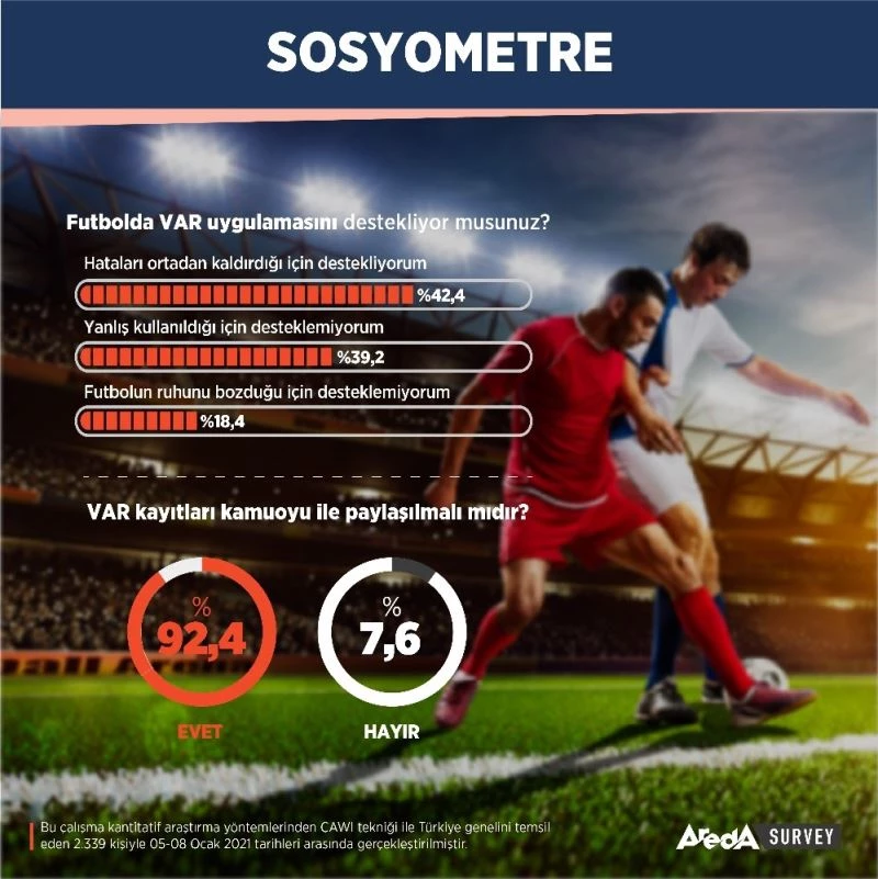 Karşılaşma devam ederken maçın orta hakeminin karar vermekte güçlük çektiğini pozisyonlarda bir başka hakemin pozisyonu video aracılığıyla tekrar izlemesi anlamına gelen VAR sistemi, orta hakeme karar verme noktasında yardımcı oluyor. Areda Survey Araştırma Şirketi’nin hazırladığı Sosyometre araştırmasına göre, futbolda VAR uygulamasını ‘hataları ortadan kaldırdığı’ gerekçesiyle destekleyen katılımcıların oranı yüzde 42.4. Aynı araştırmaya göre, VAR sistemini yanlış kullanıldığı için desteklemeyen vatandaşların oranı yüzde 39.2 olurken, katılımcıların yüzde 18.4’ü ise sistemin futbolun ruhunu bozduğunu ifade ediyor.