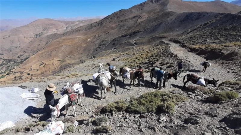 Van Büyükşehir Belediyesi Su ve Kanalizasyon İdaresi (VASKİ) Genel Müdürlüğü, kuraklık nedeniyle birçok evin susuz kaldığı Bahçesaray ilçesinde, su kaynağının bulunduğu 3 bin 500 metre rakımlı Sovak Dağı’nın zirvesine malzemeleri katır sırtında taşıdı.