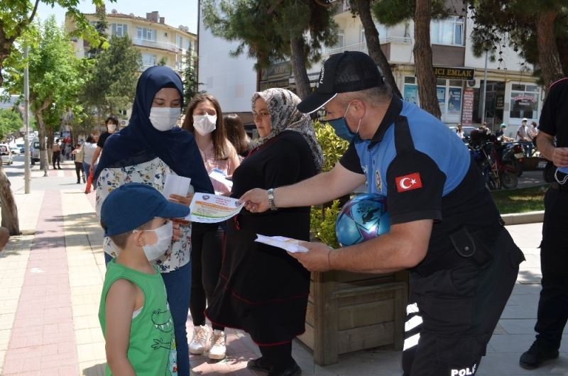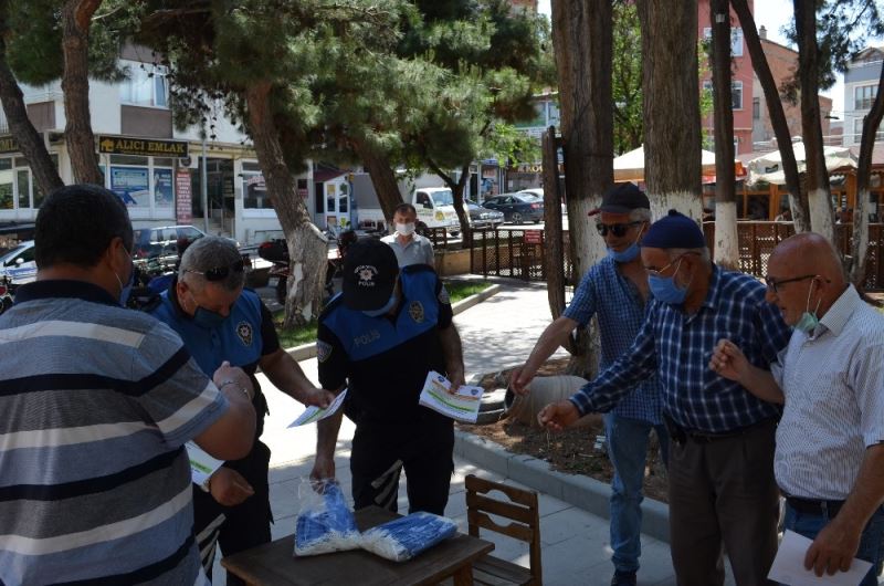 Amasya’nın Merzifon ilçesinde polisler, Medrese Parkı’nda vatandaşlara maske ve broşür dağıtarak, sosyal mesafeyi ihmal edenleri uyardı.