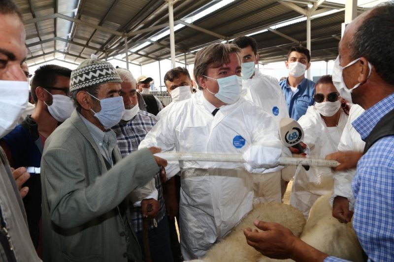 Aksaray’da canlı hayvan pazarını denetlemeye giden Vali Hamza Aydoğdu, alıcı ve satıcı arasında pazarlık yaparak kurbanlıkları sattı.