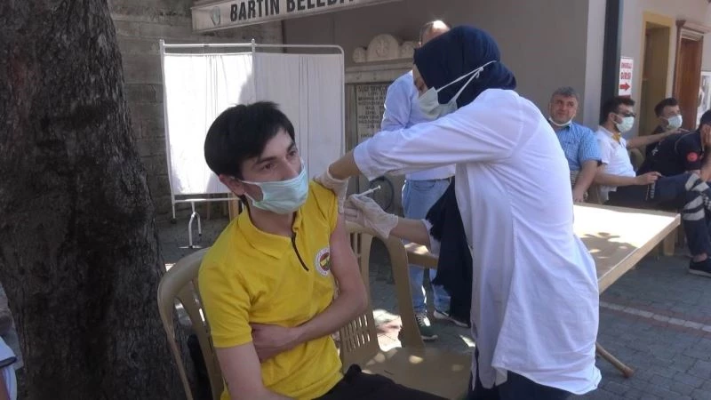 Bartın’da başlatılan “yerinde aşı uygulaması” kapsamında aşılarını olmayan vatandaşlar caddede kurulan mobil aşı istasyonunda aşılarını olmaya başladı.