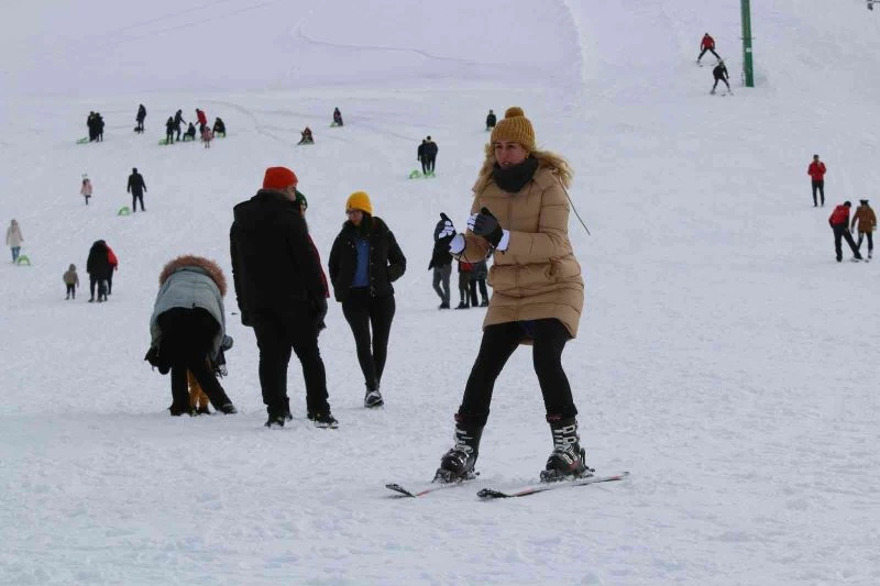Elazığ’da ara tatil ve hafta sonunu fırsat bilen vatandaşlar, göl manzaralı Hazarbaba Kayak Merkezine akın etti.