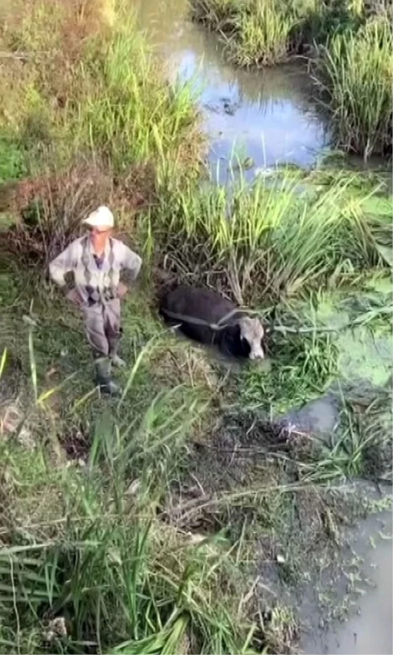 Vatandaşlar su kanalına düşen inek için seferber oldu
