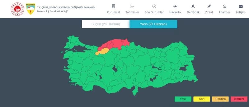 Bartın Valiliğince yapılan açıklamada Batı Karadeniz’de halen kuvvetli olarak devam eden sağanak yağışların bu gece saatlerinden itibaren etkisini artırarak 27 Haziran Pazartesi günü gece saatlerine kadar devam etmesi beklendiği belirtildi. Yapılan açıklamada, "Batı Karadeniz geneli çok kuvvetli (51-75 kg/m2/12 saat), Bartın, Karabük, Zonguldak, Düzce ve Kastamonu çevreleri ile Sinop’un iç ve batısında yer yer şiddetli (76-100 kg/m2/12 saat), Bartın il geneli ile Kastamonu’nun kuzeyi, Karabük’ün kuzey ve batısı, Sinop’un batısı, Zonguldak’ın iç kesimleri ile Düzce’nin batısında yer yer aşırı (100 kg/m2/12 saat) olması beklendiğinden vatandaşlarımızın meydana gelebilecek ani sel, su baskın, heyelan, yağış anında dikkatli ve tedbirli olmalarını önemle rica ederiz" ifadelerine yer verildi.