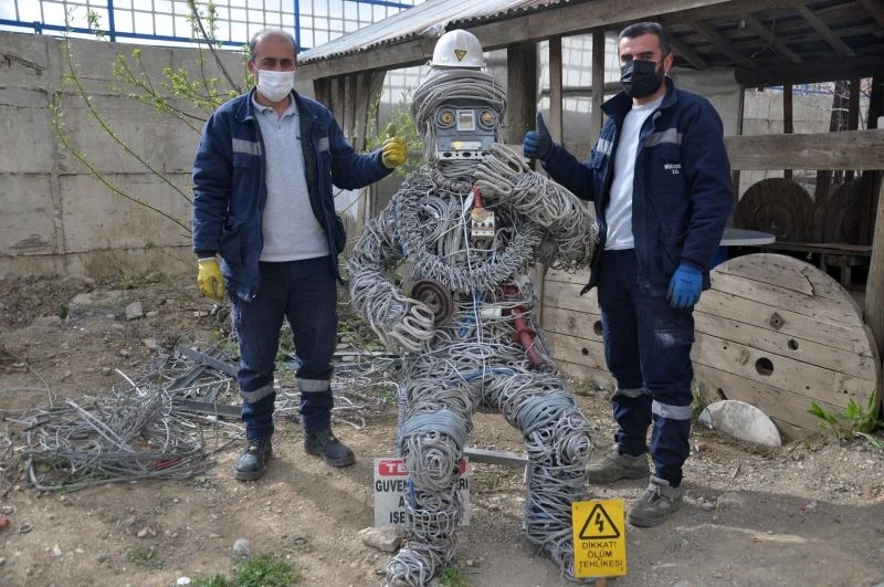 Hurda malzemeleri sanata dönüştüren Sabri Akdoğan, “Atık malzemeler birikiyordu. Bizde çevreye dikkat çekmek için tel adam yapmaya başladık. Kullanılmayacak ve eski tüm hurda malzemelerini kullandık. Yaptığımız bu tel adam bir haftamızı aldı ama aralıklı yaptık. Biz bunu kablo, şalter, boru ve iletkenler gibi değişik malzemeyle yaptık. Özellikle baş kısmı için de termik kullandık. Hepsi tamamen kullanılmayacak ve yanmış malzemelerden oluşuyor. Altındaki sandalye bile atık malzemelerden oluşuyor. VEDAŞ çalışanları olarak üzerimize düşen tüm sorumlulukları yerine getirmeye hazırız. Bununla beraber elektrik direklerimizin tehlikeli olduğunu ve yanlarına kimse yaklaşmasın diye de robotumuzun yanına uyarı levhalarını da bıraktık. Bize bu konuda destek veren tüm arkadaşlarımıza da teşekkür ederiz” dedi.