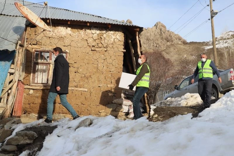 Karlı bölgeyi aşarak tespit ettikleri evleri tek tek ziyaret ederek gıda yardımında bulunup onların sorun ve sıkıntılarını yerinde dinleyen Vefa Sosyal Destek Grubu, toprak evlerde zor şartlar altında yaşam mücadelesi veren ailelerle bir araya geldiler.