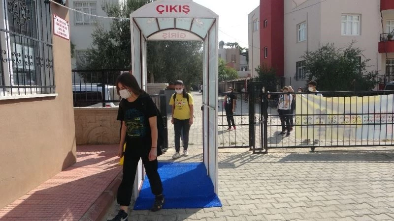 Kozan’da ilk defa bir okulun giriş kapısına yapılan dezenfektan tüneli ile öğrencilerin sağlıklarının korunmasında önemli rol oynuyor.