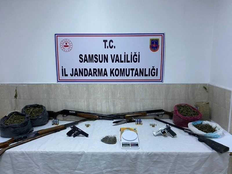 Vezirköprü ilçesinde yapılan istihbari çalışmalar neticesinde Ahmetbaba Mahallesi’nde Samsun İl Jandarma Komutanlığına bağlı Kaçakçılık ve Organize Suçlarla Mücadele (KOM) Şube Müdürlüğü ve Vezirköprü İlçe Jandarma Komutanlığı ekiplerince şüpheli 2 şahsın ev, eklenti ve araçlarında arama yapıldı. Yapılan arama sonucunda 3 bin 300 gram kubar esrar maddesi, 2 adet saksı içerisinde dikili kenevir bitkisi, 1 adet hassas terazi, 4 adet av tüfeği, 2 adet tabanca, 1 adet 17 cm uzunluğunda bıçak ve çok sayıda fişek ele geçirildi.
